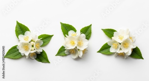 Fototapeta premium Fresh jasmine blossoms with green leaves on white background