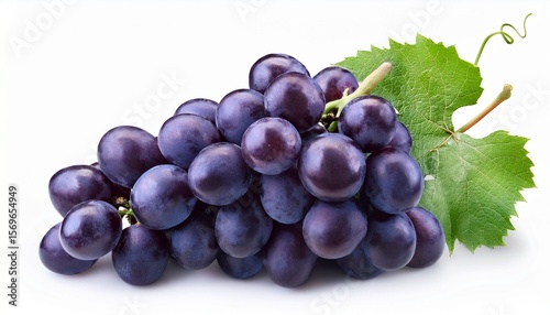 © Ashen, Fototapeta premium fresh juicy dark purple grape cluster with green leaf isolated on white background