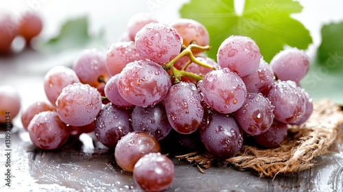 © Phurichai, Obraz premium Fresh Juicy Grapes with Water Drops on a Wooden Table Surrounded by Green Leaves and Natural Light