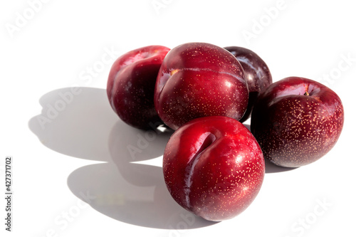 Obraz premium Fresh juicy tasty plums on an isolated white background.