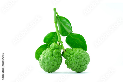 © 149 Studio, Fototapeta premium Fresh Kaffir lime or Citrus Bergamot fruit with green leaves (both dorsal side and ventral side) isolated on white background close up stack