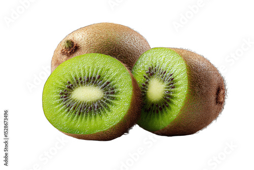 Obraz premium Fresh kiwi fruit, whole and halved, vibrant green flesh, brown skin