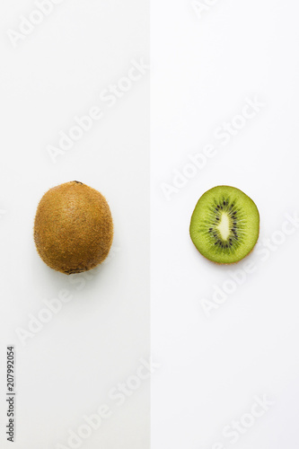Obraz premium Fresh kiwi whole fruit and slice on grey white background
