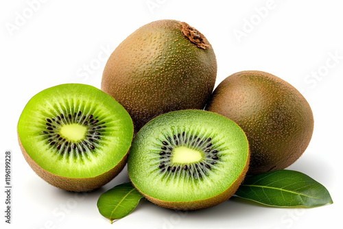 © sarinya, Obraz premium Fresh Kiwis with Leaves, kiwifruit, green, healthy, vitamin c, delicious