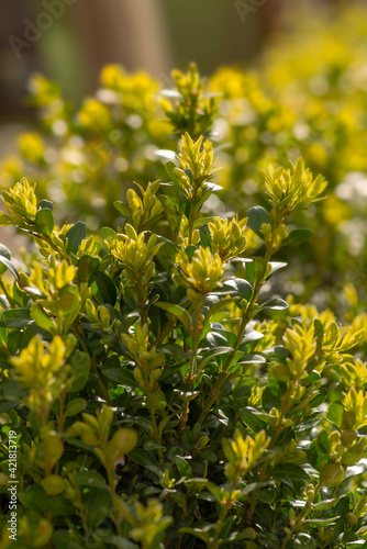 © TSViPhoto, Obraz premium Fresh leaf sprouts myrtle in sunbeams in the garden