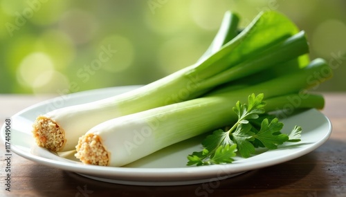 Obraz premium Fresh leek on a white plate with natural light exposure , kitchen, leek, food