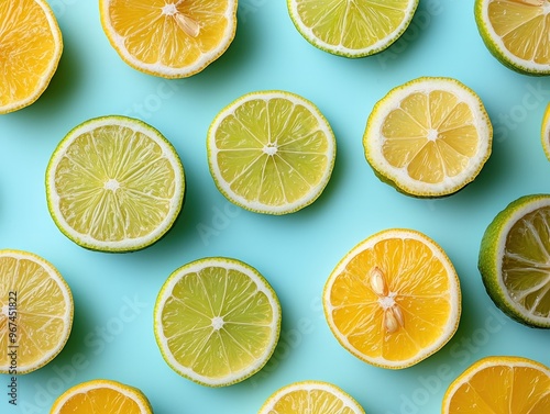 Fototapeta premium Fresh Lemon and Lime Slices on Blue Background