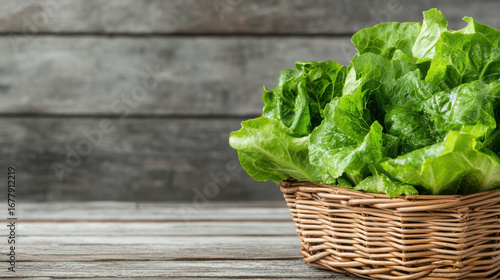 Fototapeta premium Fresh lettuce leaves arranged wicker basket rustic wooden table evoke sense of freshness