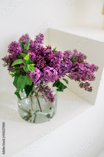 Fototapeta premium Fresh lilac branches in a vase in a bright interior