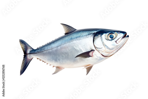 © boule1301, Naklejka premium Fresh mackerel fish with detailed scales and fins isolated on white transparent background. Concept of seafood and marine life