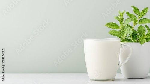 © tugkiara, Obraz premium Fresh milk with mint sprigs on a light background