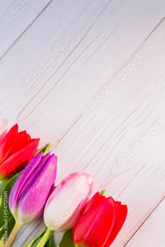 Obraz premium fresh multicolor tulip blooms are resting on pale wood plank flat lay...