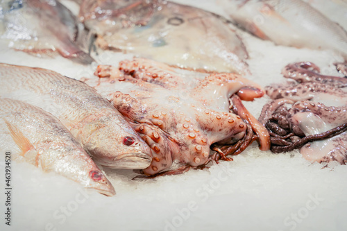 Naklejka premium Fresh octopus and fish on ice in supermarket. Sale of seafood. Open showcases , counter of seafood market
