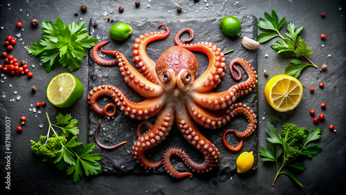 © MeMosz, Fototapeta premium Fresh octopus on black stone background