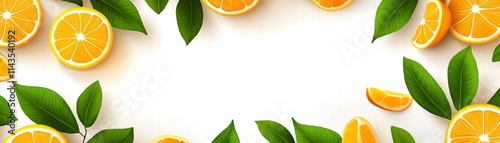 Fototapeta premium Fresh Orange Slices and Leaves Border on White Background