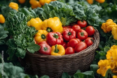 © D, Fototapeta premium Fresh Organic Harvest: Basket of Tomatoes, Peppers, and Greens for Farm-to-Table Cooking