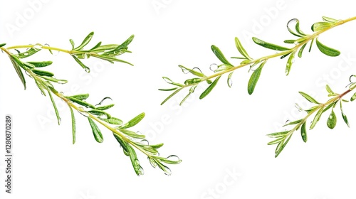 © tiantian, Fototapeta premium Fresh Organic Rosemary Herb Sprigs with Water Droplets Isolated on Pure White Background for Culinary and Aromatic Essential Oil Applications