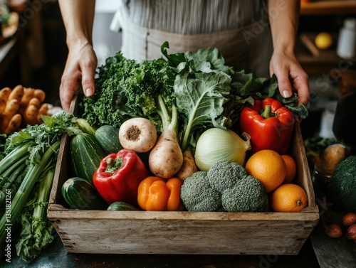 Fototapeta premium Fresh Organic Vegetables in Rustic Wooden Crate Held by Farmer – Healthy...