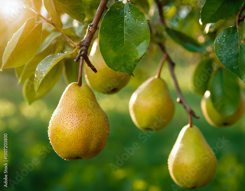 © keavuth, Obraz premium Fresh Pears Hanging on Tree with Morning Dew
