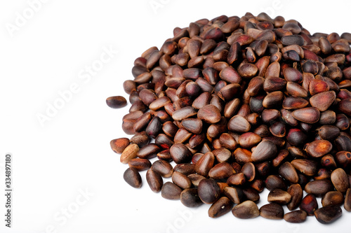 © lelechka, Fototapeta premium Fresh peeled cedar nuts isolated on white background, closeup