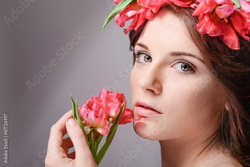 © robotytska, Naklejka premium Fresh photo fashion model with great hair and flowers in her hai