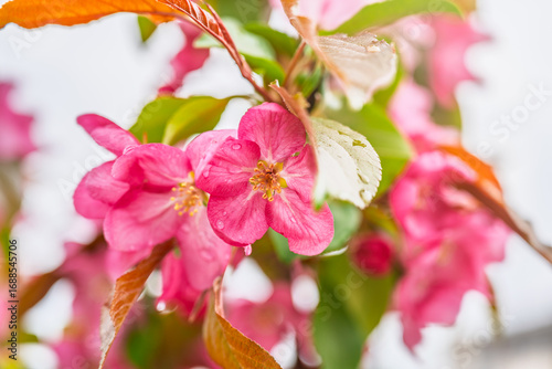 Obraz premium Fresh pink flowers of a blossoming apple tree with blured background