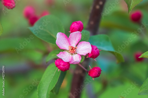 Fototapeta premium Fresh pink flowers of a blossoming apple tree with blured background