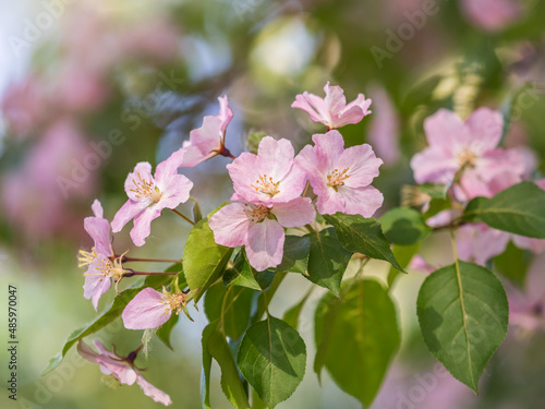 Obraz premium Fresh pink flowers of a blossoming apple tree with blured background