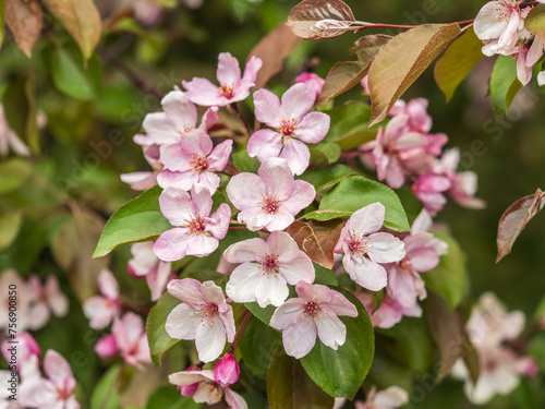 Obraz premium Fresh pink flowers of a blossoming apple tree with blured background
