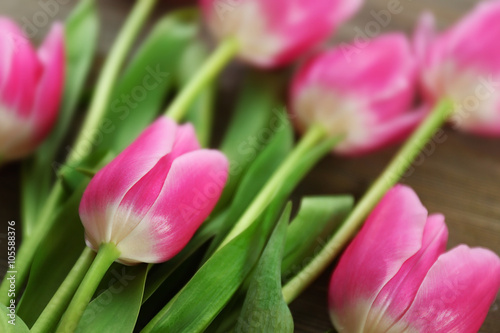 Fototapeta premium Fresh pink tulips on a wooden table, close up