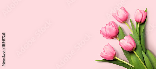Fototapeta premium Fresh pink tulips with green leaves placed on a solid pastel pink background, creating a bright and cheerful floral composition. banner
