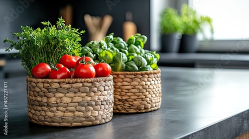 © Manzoor, Fototapeta premium Fresh produce in woven baskets on a kitchen countertop for eco-friendly and sustainable design.