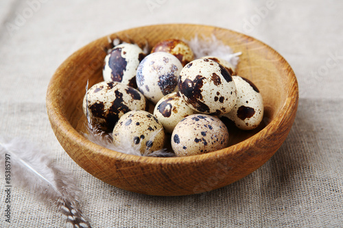 Fototapeta premium fresh quails eggs and feathers