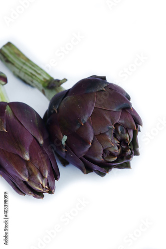 Fototapeta premium Fresh raw artichokes isolated on a white background. Cut Cynara scolymus
