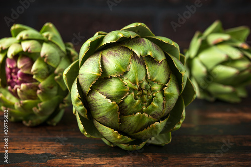Fototapeta premium Fresh raw organically grown artichoke flower buds on wooden table