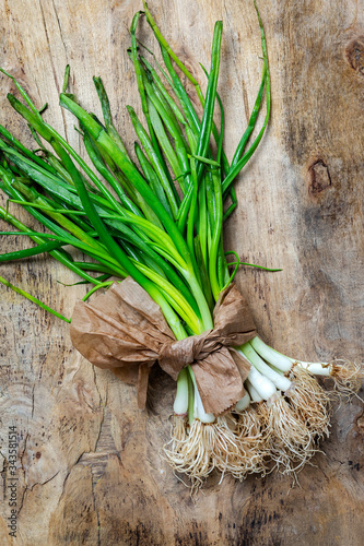 © Eduardo Lopez, Obraz premium Fresh red and white onions on wood background