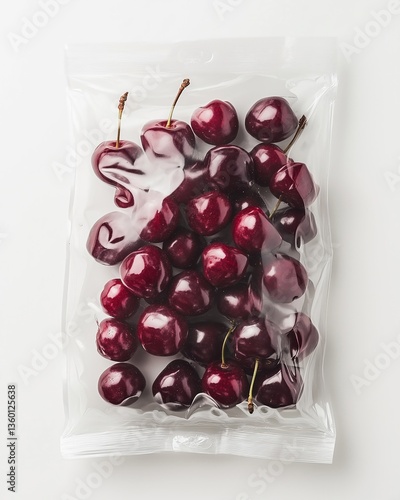© slowbuzzstudio, Obraz premium Fresh Red Cherries in Clear Plastic Bag on White Background Top View for Sale