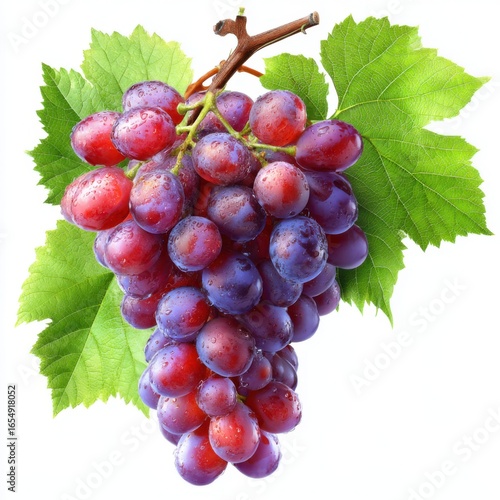 © EpicFade, Fototapeta premium Fresh Red Grapes Bunch Still Life with Green Leaves Isolated on White Background Close Up Studio Shot