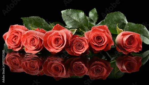 Obraz premium Fresh red roses with droplets reflecting on a dark surface in a serene...
