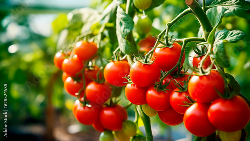 © Aghavni, Obraz premium fresh red tomatoes on a branch in the garden. Generative AI