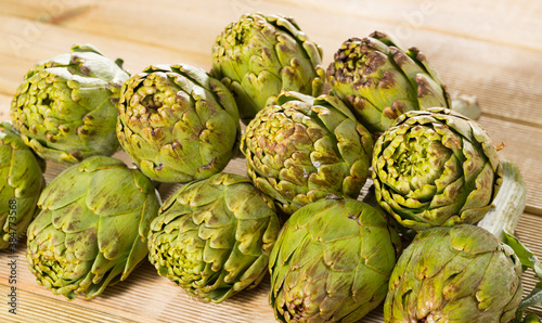 © JackF, Obraz premium Fresh ripe green artichokes on light wooden background