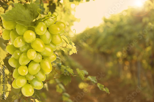 © New Africa, Fototapeta premium Fresh ripe juicy grapes growing on branches in vineyard, space for text