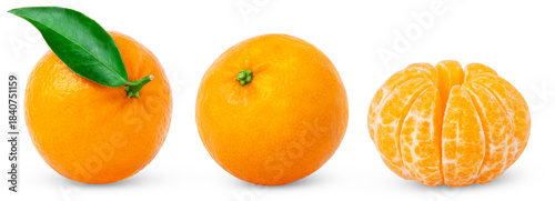 © Oleh, Obraz premium Fresh ripe mandarin, tangerine or clementine fruit with green leaf and peeled mandarin isolated set.