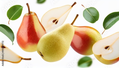 Obraz premium Fresh ripe Pear falling in the air, isolated on white background. Food...