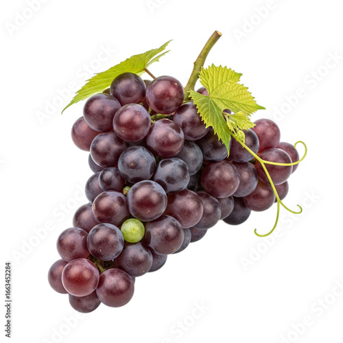 © mahafuza, Fototapeta premium Fresh ripe purple grapes cluster with green leaves isolated for healthy eating transparent background