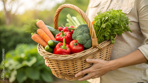 © Md, Fototapeta premium Fresh, ripe vegetables like tomatoes, cucumbers, and peppers are in a wicker basket, held by a woman, signifying a healthy and fresh harvest of organic food