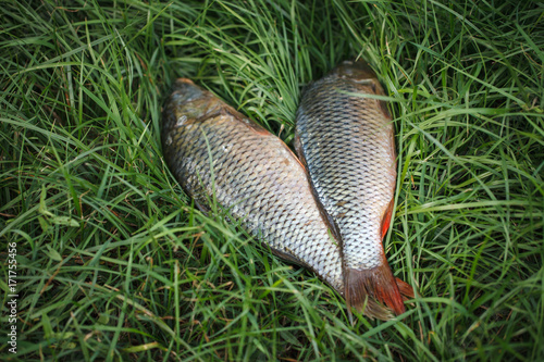 © Юлия Буракова, Obraz premium fresh river fish on the grass.