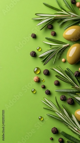 Fototapeta premium Fresh Rosemary and Black Peppercorns on Green Background
