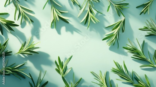 Naklejka premium Fresh rosemary leaves arranged artistically on a soft green background showcasing natural beauty and culinary versatility.