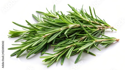 © udomsak, Fototapeta premium Fresh rosemary leaves scattered on a plain white background, showcasing their delicate texture and vibrant green color